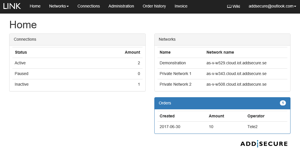 The Link Manager dashboard provides an overview of your AddSecure Link system solution, and it is the first screen displayed when you log in. It can also be accessed by clicking Home in the menu bar.