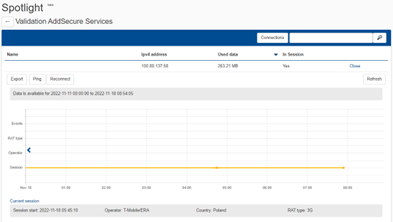 Spotlight provides a detailed, time-correlated view of the device provisioning status, real time network signaling history, and real time connection history. This information is presented together on a timeline for easy visual analysis. Additional details e.g. ping and reconnect events is displayed on the Spotlight timeline.